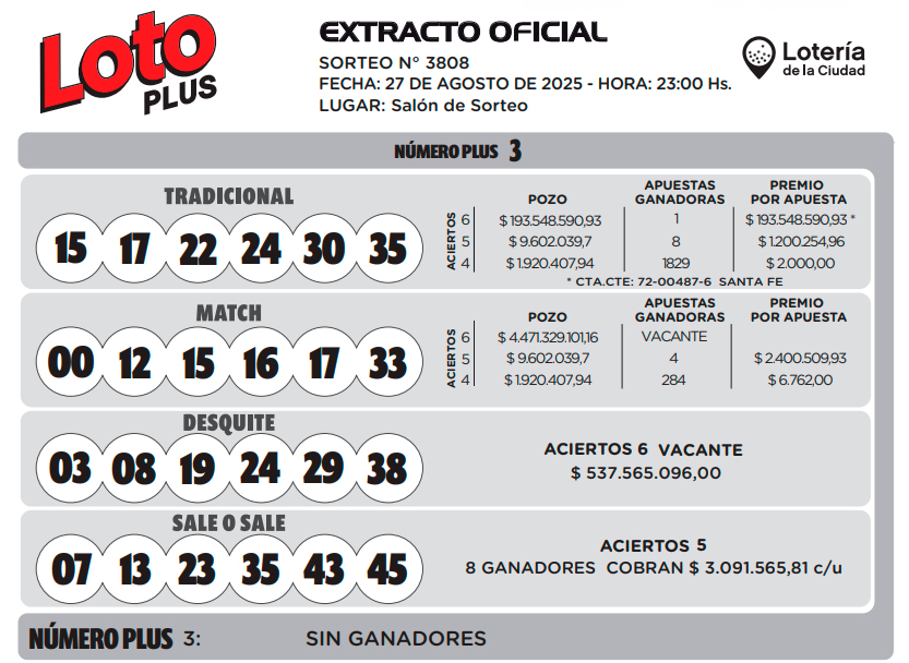 Este miércoles 27 de agosto en el sorteo Tradicional del Loto salieron el 15-17-22-24-30-35, el pozo de $193.548.591 quedó en manos de un apostador de Santa Fe.