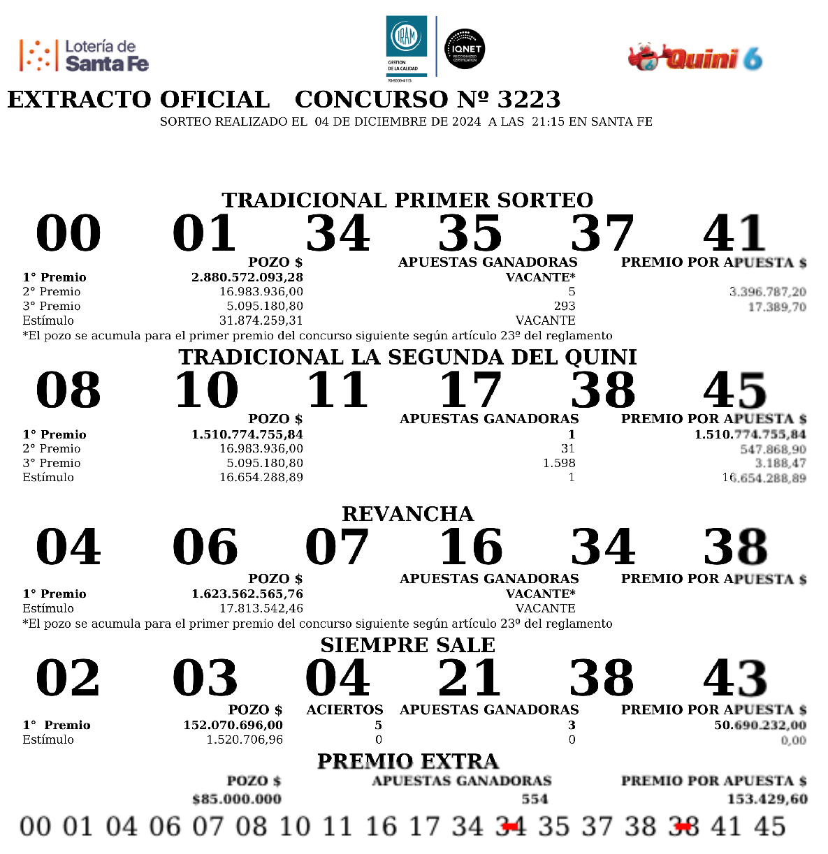 En el sorteo Tradicional del Quini 6 salieron el el 00-01-34-35-37-41. Ningún apostador acertó todos los números y el pozo de $2.880.572.093 quedó vacante.