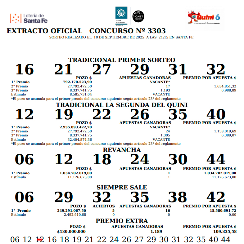 Este miércoles se sorteó el concurso N° 3.303 del Quini 6, de la Lotería de Santa Fe.