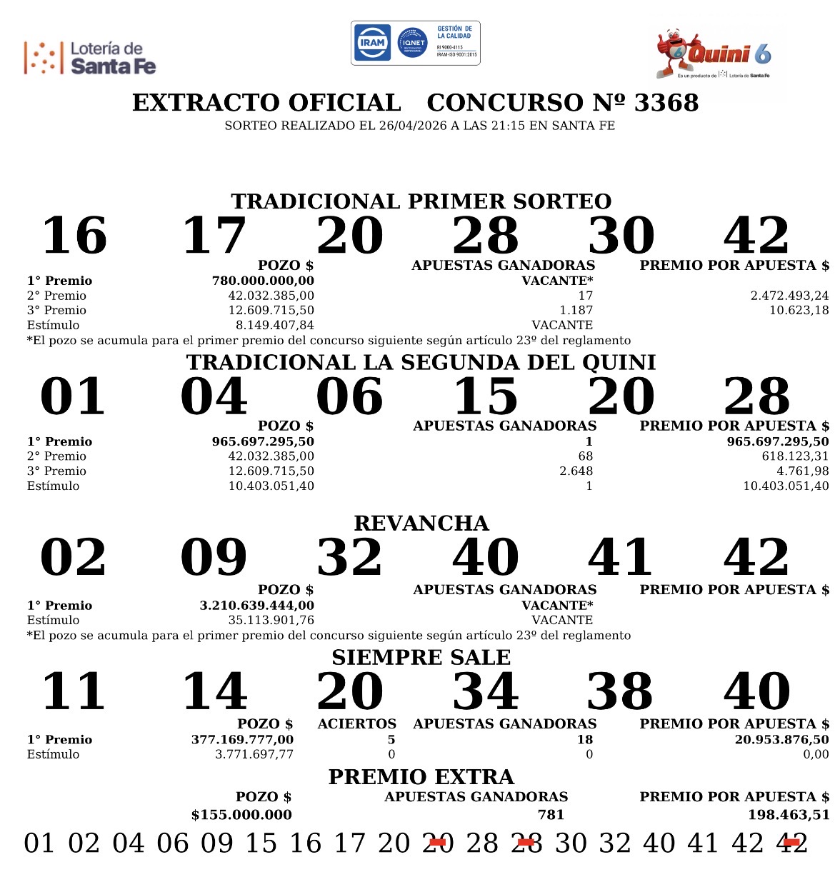 En el sorteo del Quini 6 realizado este domingo, 26 de abril, no se registraron ganadores en la modalidad Tradicional.