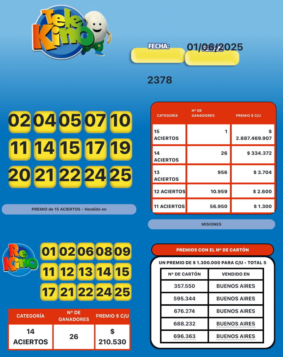 Sociedad | Aquí el resultado del sorteo 2.378 del Telekino que en su versión tradicional el pozo de más de $2.800 millones quedaron en manos de un apostador, mientras que el pozo del Rekino fue para 26 apostadores.
