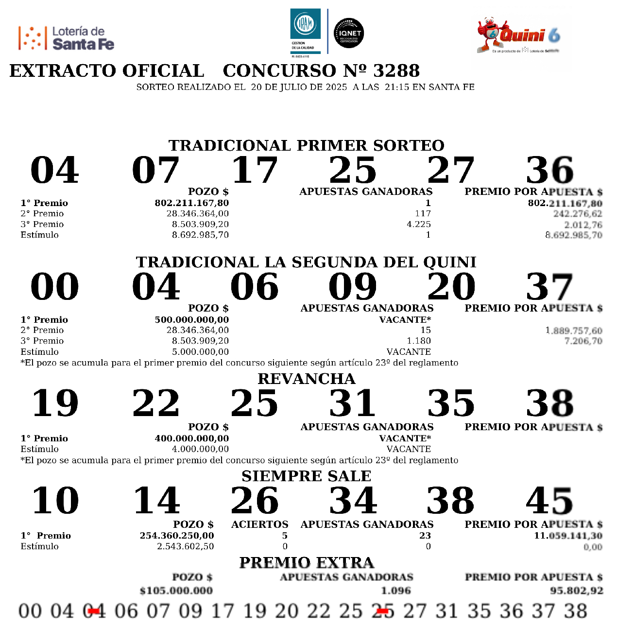 Este domingo 20 de julio en el sorteo Tradicional del Quini 6 salieron el 04-07-17-25-27-36, el pozo de $802.211.167 quedó en manos de un apostador de Campana, provincia de Buenos Aires.