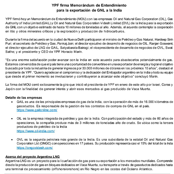 YPF firmó un Memorándum de Entendimiento (MOU) para exportar Gas Natural Licuado (GNL) de Vaca Muerta a la India. El MOU se suscribió con las principales empresas energéticas de la India: Oil and Natural Gas Corporation (OIL), Gas Authority of India Limited (GAIL) y Oil and Natural Gas Corporation Videsh Limited (OVL).