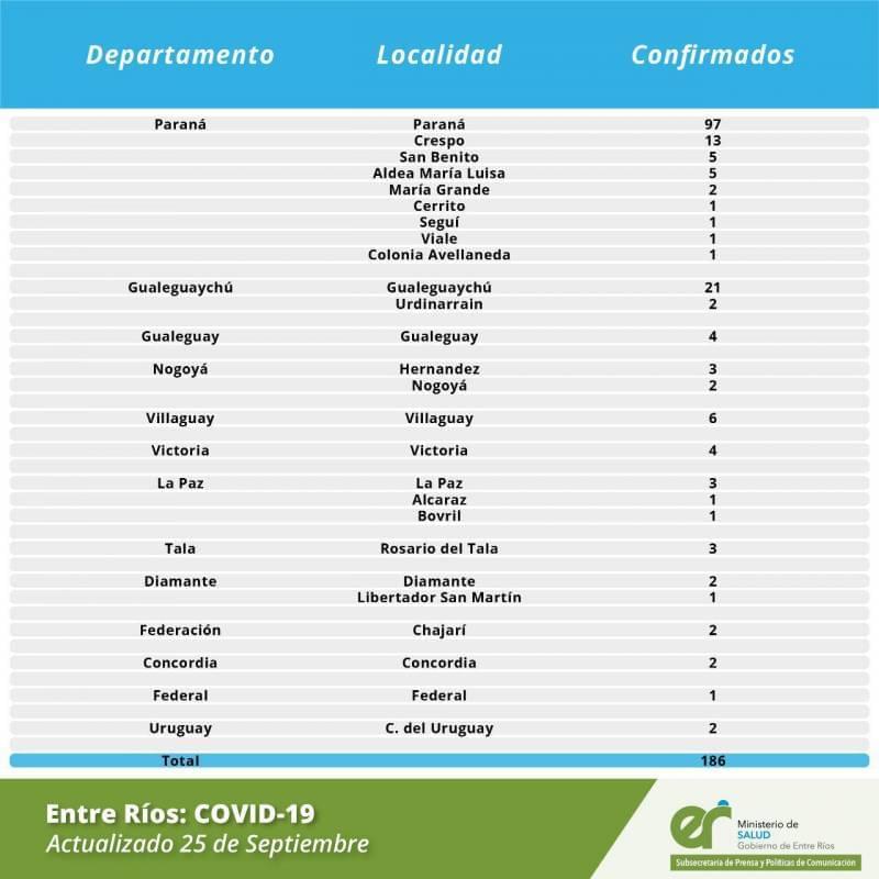 A partir de los datos reportados al 25 de Septiembre de 2020 por el área de Vigilancia Epidemiológica del Ministerio de Salud, en Entre Ríos se han sumado 186 casos de Coronavirus que se distribuyen por Departamento de la siguiente manera: