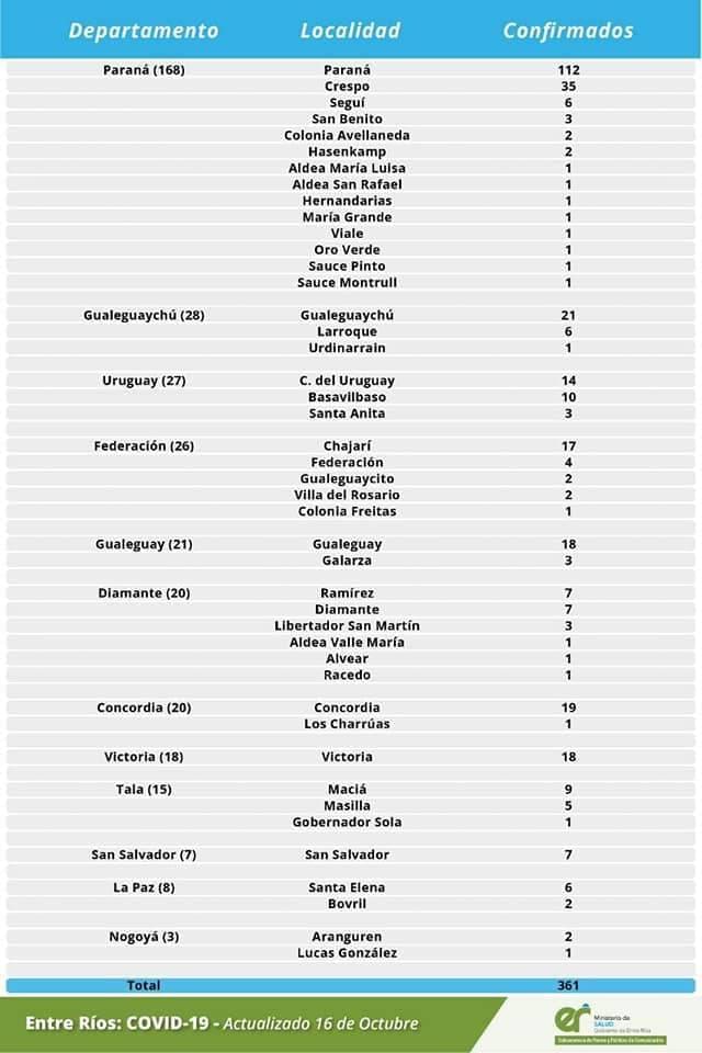 Este viernes se registraron 361 nuevos casos de coronavirus en Entre Ríos. Se reclasificó un caso a otra provincia del Departamento Villaguay.
