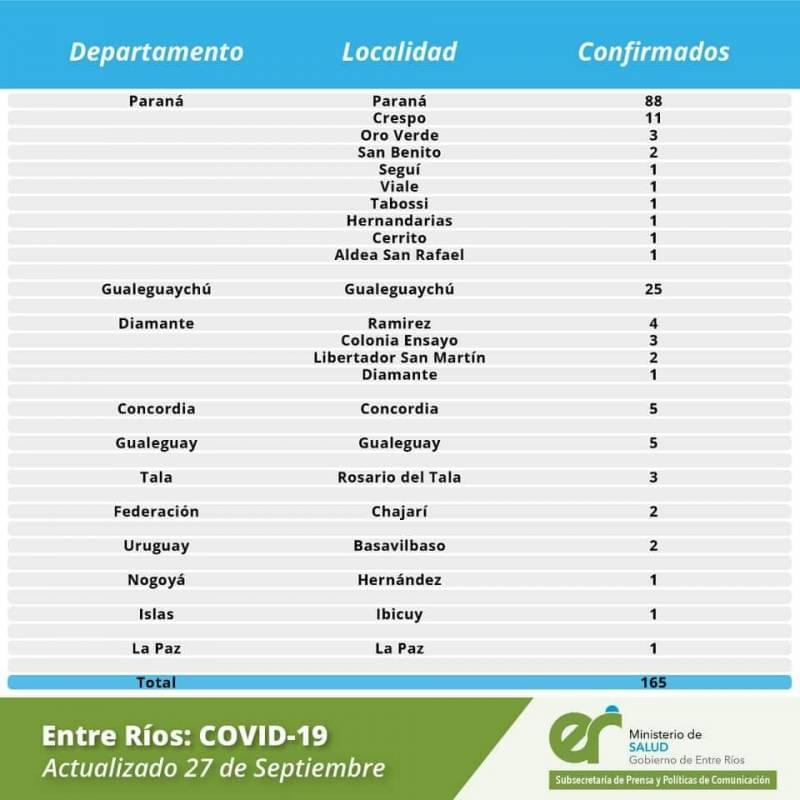 De acuerdo a los datos reportados al 27 de septiembre de 2020 por el área de Vigilancia Epidemiológica del Ministerio de Salud, en Entre Ríos se han sumado 165 casos de Coronavirus que se distribuyen por Departamento de la siguiente manera: