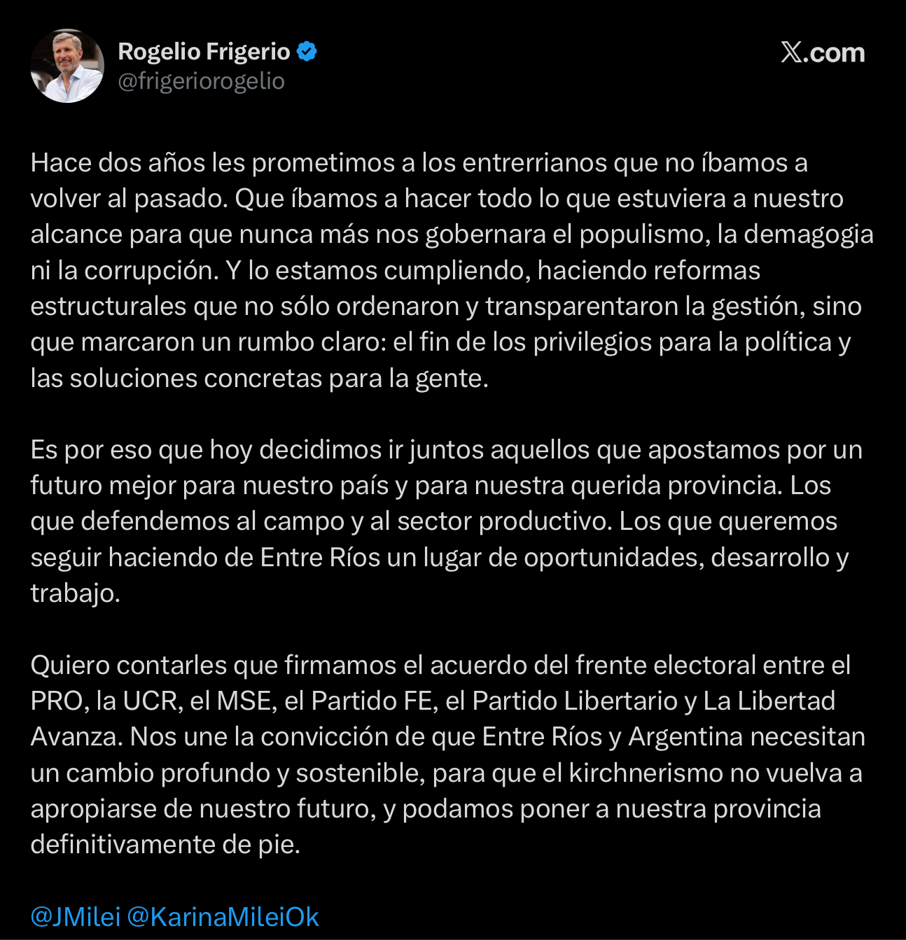 “Hoy decidimos ir juntos aquellos que apostamos por un futuro mejor para nuestro país y para nuestra querida provincia”, posteó en X el Gobernador, Rogelio Frigerio. Y agregó: “Los que defendemos al campo y al sector productivo. Los que queremos seguir haciendo de Entre Ríos un lugar de oportunidades, desarrollo y trabajo”.