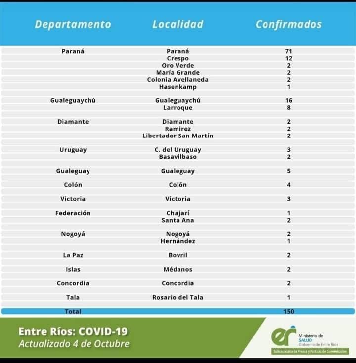En virtud de los datos reportados al 4 de Octubre de 2020 por el área de Vigilancia Epidemiológica del Ministerio de Salud, en Entre Ríos se han sumado 150 casos de coronavirus que se distribuyen por Departamento de la siguiente manera: