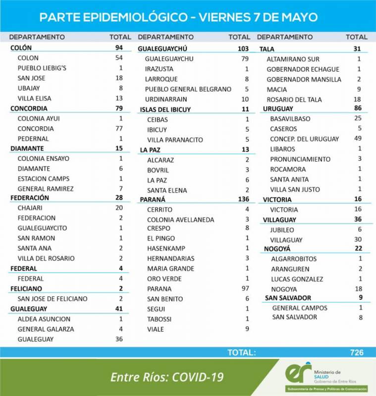 El área de Vigilancias Epidemiológica del Ministerio de Salud, confirmó que en Entre Ríos este viernes se registraron 726 nuevos casos de coronavirus.