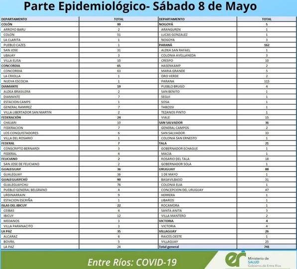 El área de Vigilancias Epidemiológica del Ministerio de Salud, confirmó que en Entre Ríos este sábado se registraron 741 nuevos casos de coronavirus.