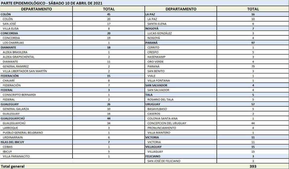 En virtud de los datos reportados este sábado por el área de Vigilancia Epidemiológica del Ministerio de Salud, en Entre Ríos se han sumado 393 casos de coronavirus. En el Departamento Uruguay son 57 los nuevos casos, distribuidos 5 en Basavilbaso, 1 en Villa Mantero, 2 en Caseros, 4 en Pronunciamiento, 1 en Colonia Santa Ana y 44 en Concepción del Uruguay.
