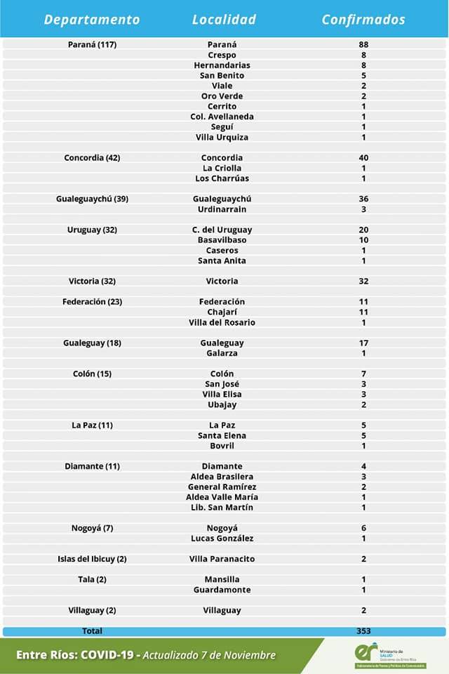 El área de Vigilancia Epidemiológica del Ministerio de Salud, confirmó que en Entre Ríos este sábado se registraron 352 nuevos casos de coronavirus, 32 en el Departamento Uruguay, 10 en Basavilbaso y 1 en Santa Anita.