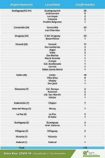 A partir de los datos reportados al 17 de noviembre de 2020 por el área de Vigilancia Epidemiológica del Ministerio de Salud, en Entre Ríos se han sumado 178 casos de coronavirus. Reclasificación: se resta un caso de la ciudad de Paraná y se suma a San Benito.