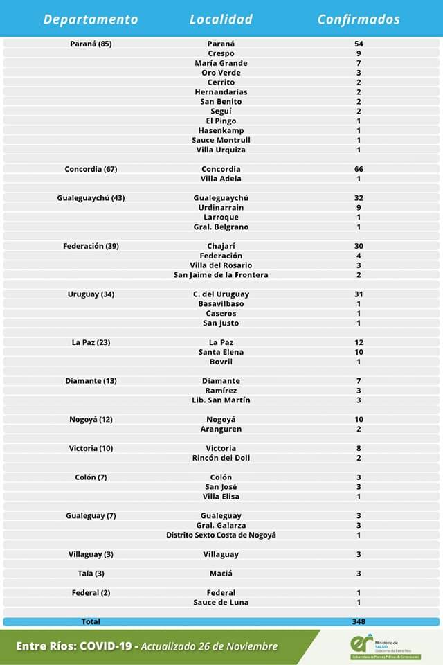 A partir de los datos reportados al 26 de noviembre de 2020 por el área de Vigilancia Epidemiológica del Ministerio de Salud, en Entre Ríos se han sumado 348 casos de coronavirus.