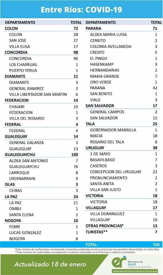 El área de Vigilancia Epidemiológica del Ministerio de Salud, confirmó que en Entre Ríos este lunes se registraron 556 nuevos casos de coronavirus. En el Departamento Uruguay 38, distribuidos en: 1 en 1º de Mayo; 3 Caseros; 2 Pronunciamiento; 1 San Justo; 22 Concepción del Uruguay; 2 Santa Anita y 7 Basavilbaso.
