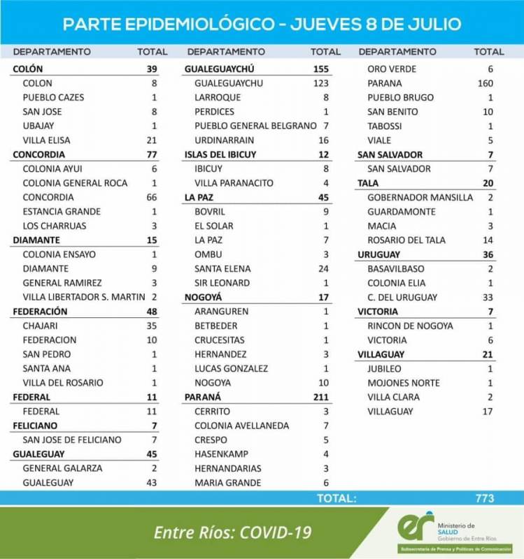 El área de Vigilancias Epidemiológica del Ministerio de Salud, confirmó que en Entre Ríos este jueves se registraron 773 nuevos casos de coronavirus.