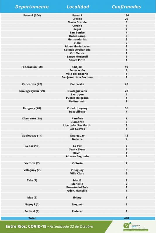 Este jueves se registraron 428 nuevos casos de coronavirus en Entre Ríos. El área de Vigilancia Epidemiológica del Ministerio de Salud precisamente que se destruyen de la siguiente manera: