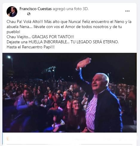 Néstor Cuestas nació el 17 de agosto de 1944 en la ciudad de Paraná y el 12 de agosto de 1958, formó junto a su hermano Rubén, el dúo "Los baqueanos" que luego se convertirían en el reconocido dúo "Los hermanos Cuestas", que llevó la música entrerriana a diferentes puntos del país. "Chau Pa! Volá Alto!!! Más alto que Nunca! Feliz encuentro el Neno y la abuela Nena.... llévate con vos el Amor de todos nosotros y de tu pueblo!", remarcó su hijo, Francisco en las redes sociales.
