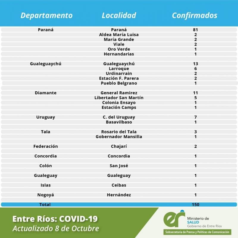 El área de Vigilancia Epidemiológica, confirmó que este jueves en Entre Ríos se registraron 150 nuevos casos de coronavirus, que se distribuyen por Departamento de la siguiente manera: