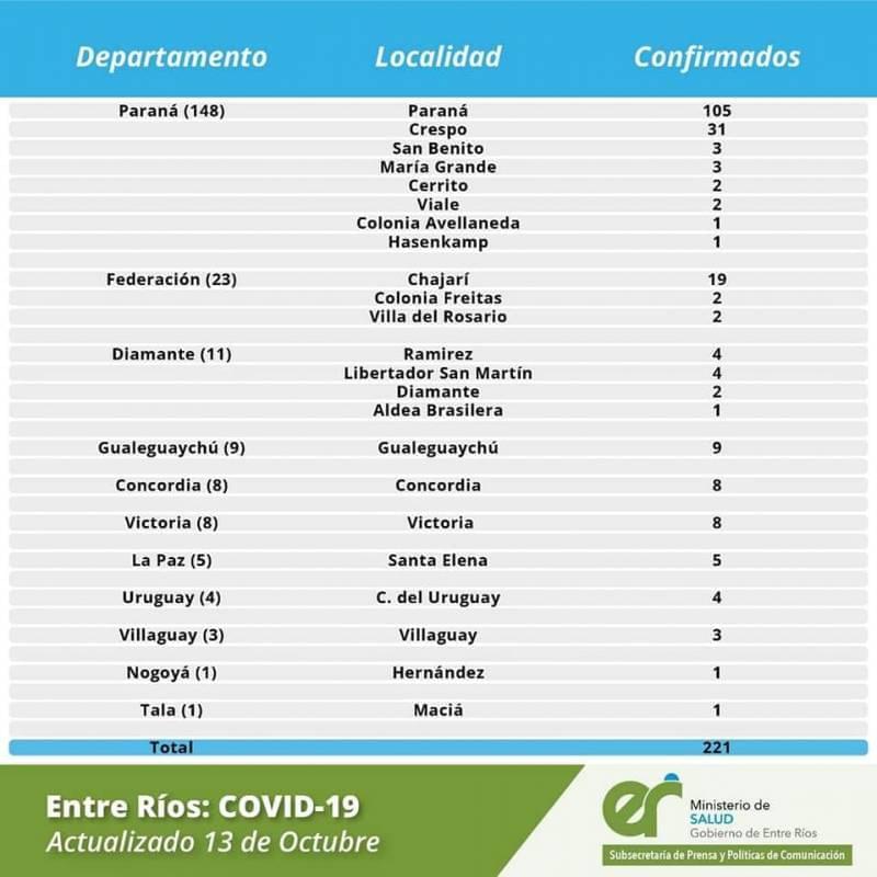 Este martes se registraron 221 nuevos casos de coronavirus en Entre Ríos. El área de Vigilancia Epidemiológica precisó cómo se distribuyen por Departamento y ciudad: