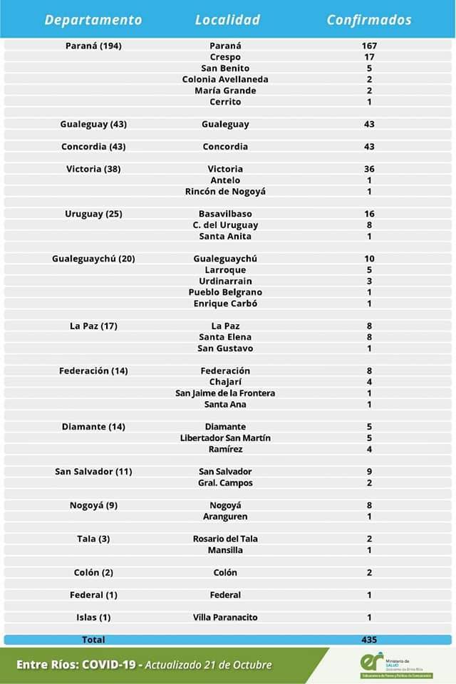Salud | La provincia sumó un total de 12.458 casos de coronavirus este miércoles, al reportarse 435 positivos en quince Departamentos. Basavilbaso "aportó" 16 de los 25 casos del Departamento Uruguay.