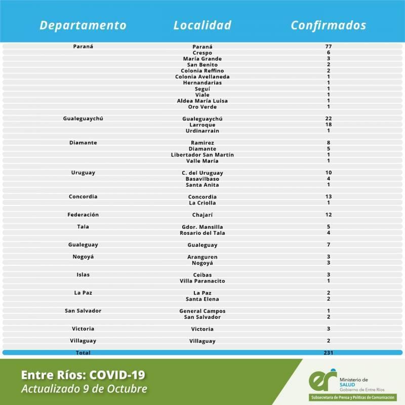 Salud | El área de Vigilancia Epidemiológica confirmó que este viernes en Entre Ríos se registraron 231 nuevos casos, 15 en el Departamento Uruguay, 4 en Basavilbaso y 1 en Santa Anita. El total de infectados (desde que comenzó la pandemia) alcanzó 9.054 casos.