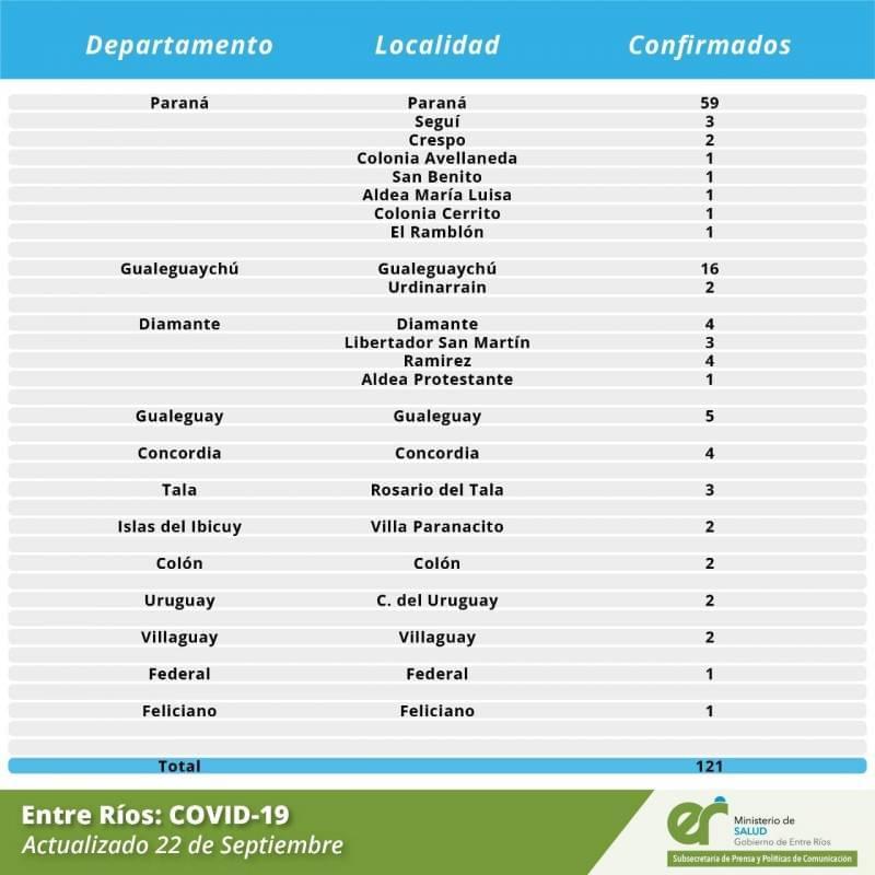 El área de Vigilancia Epidemiológica, confirmó que este martes en Entre Ríos se registraron 121 nuevos casos de coronavirus, que se distribuyen por Departamento de la siguiente manera: