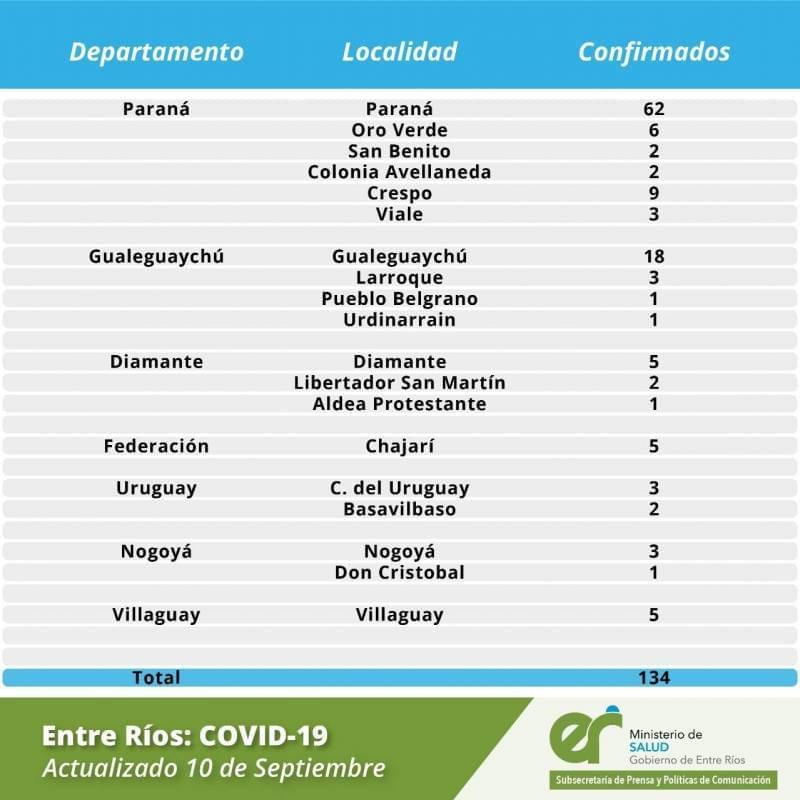 La Subsecretaria de Prensa y Políticas de Comunicación del Ministerio de Salud de Entre Ríos reportó -que de acuerdo a los datos reportados al 10 de septiembre de 2020 por el área de Vigilancia Epidemiológica del Ministerio de Salud, en Entre Ríos- se han sumado 134 casos de coronavirus que se distribuyen por Departamento de la siguiente manera: