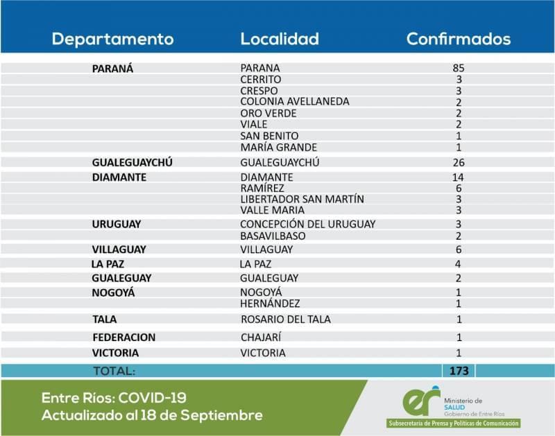 El área de Vigilancia Epidemiológica, confirmó que este viernes en Entre Ríos se registraron 173 nuevos casos de coronavirus, que se distribuyen por Departamento de la siguiente manera: