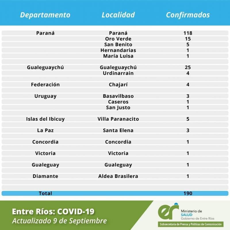 El área de Vigilancia Epidemiológica, confirmó que este miércoles en Entre Ríos se registraron 190 nuevos casos de coronavirus, que se distribuyen por Departamento de la siguiente manera:
