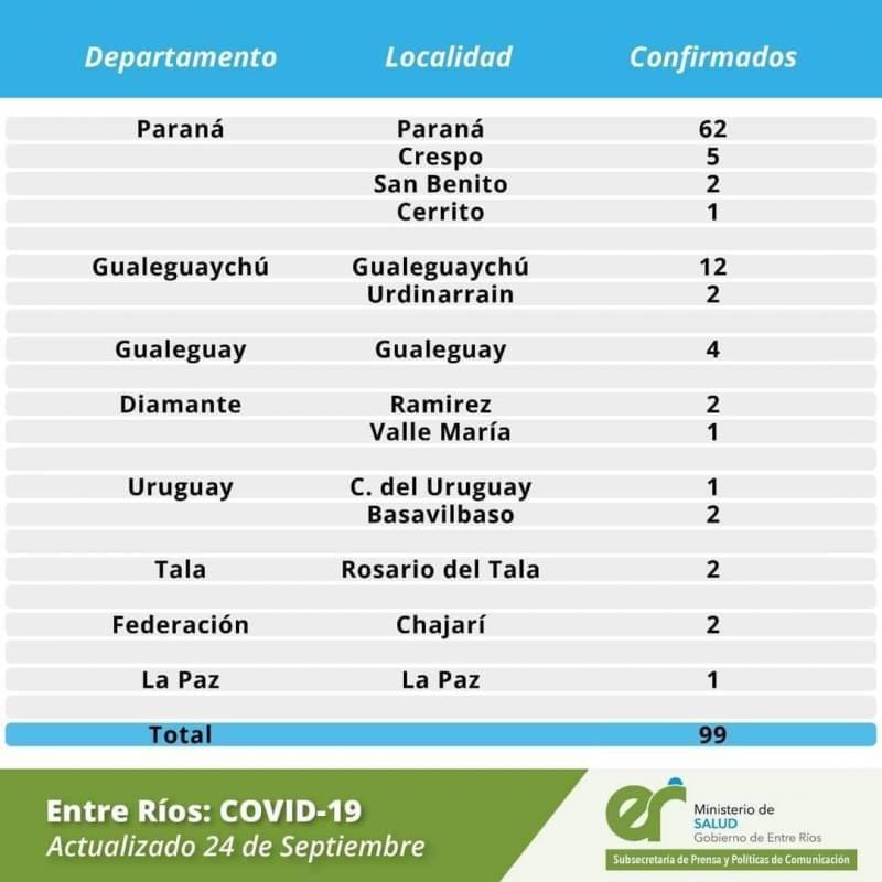El área de Vigilancia Epidemiológica, confirmó que este jueves en Entre Ríos se registraron 99 nuevos casos de coronavirus, que se distribuyen por Departamento de la siguiente manera: