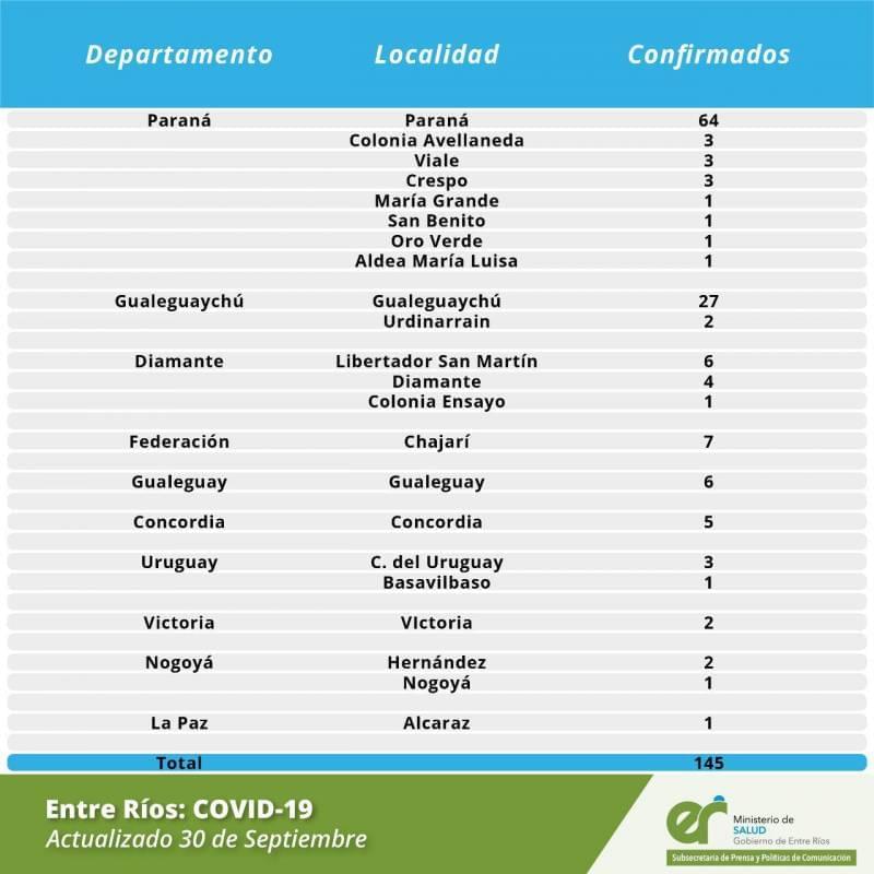 A partir de los datos reportados al 30 de septiembre de 2020 por el área de Vigilancia Epidemiológica del Ministerio de Salud, en Entre Ríos se han sumado 145 casos de coronavirus que se distribuyen por departamento de la siguiente manera: